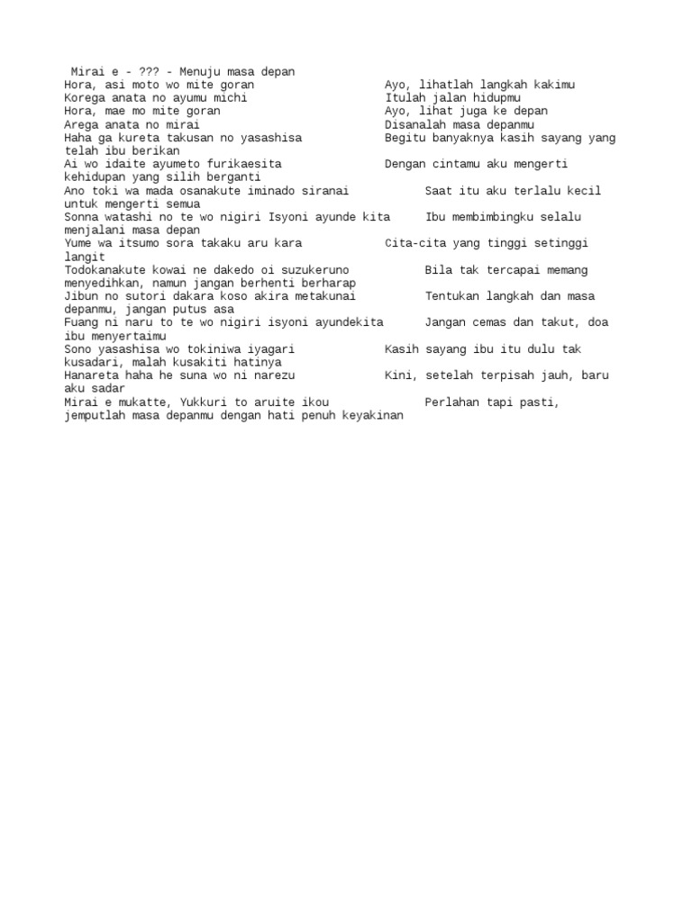Mirai E Kiroro Lirik / Haha ga kureta takusan no yasashisa ai wo idaite ayume to kurikaeshita ano toki wa mada osanakute imi.